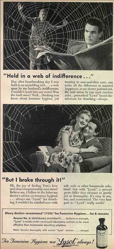 those ads are freakish - there was a whole series of them! this was something weird about the post-war era - people got really super-obsessed about their bodies - it wasn't just the Lysol douche, but a whole slew of brands marketed to both men and women for killing just about every kind of bodily odor. I recently ran across a comic-book style ad for Kolynos toothpaste, where a fetching Betty blonde is dumped by her boyfriend for having "dental double trouble" aka halitosis and "dingy teeth" - wish I could remember where. but seriously - in the 50s, how many men put their faces near enough to their wives vaginas to notice a smell or lack thereof? I wasn't aware that Good Housekeeping was advocating cunnilingus way back then. the Lysol ads are alarming - makes me wonder if they've reformulated the product much since then? |